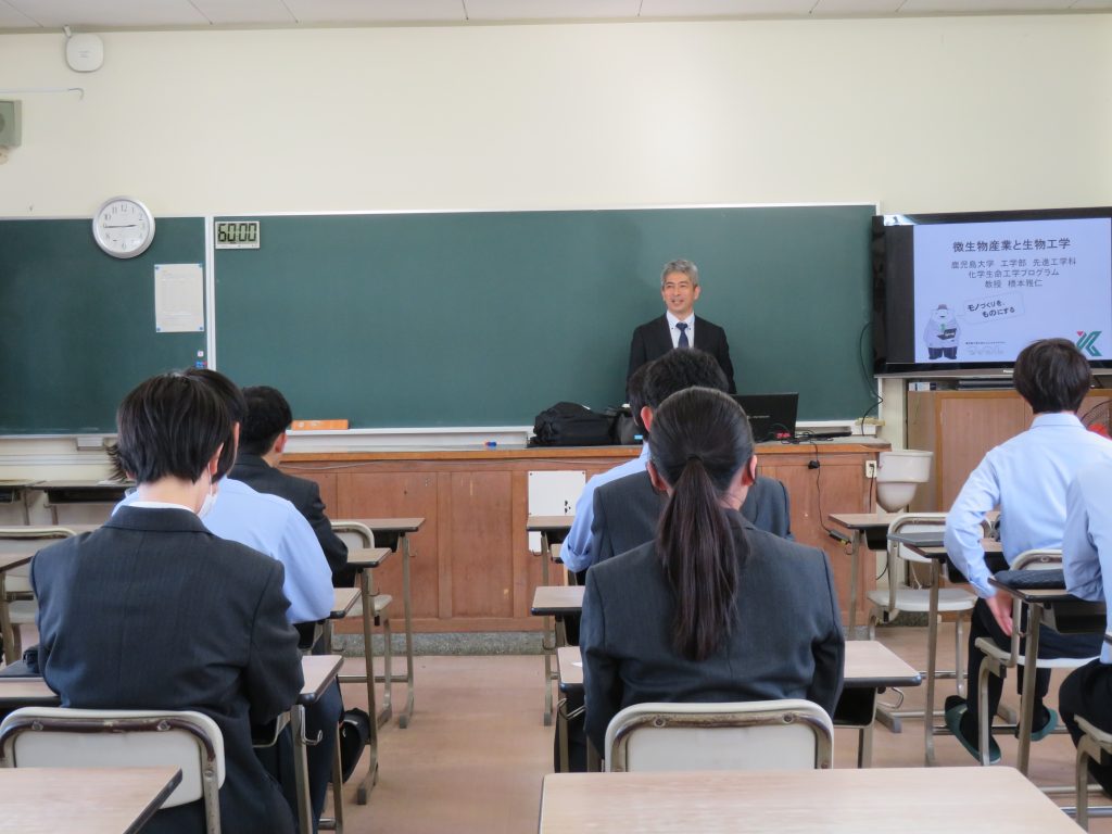 鹿児島県立志布志高等学校の1・2年生を対象に、橋本教授が「微生物産業と生物工学」をテーマに出前授業を実施しました。