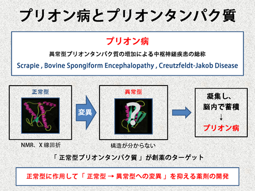 | プリオンタンパク質(PrP)は、スクレイピーやクロイツフェルト・ヤコブ病といったプリオン病の原因物質として知られており、正常型構造(PrPC)から異常型構造(PrPSC)への変異が病気を引き起こすと考えられています。そのため、PrPCに作用しPrPSCへの構造変異を抑える低分子化合物を発見することが、プリオン病の薬剤開発に繋がります。 | |||