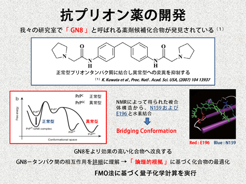 | プリオンタンパク質と低分子化合物に関してFMO計算を行った例を、これまでのプレゼンの資料を用いて紹介します。また、ここで紹介している研究内容は論文として出版されておりますので [1]、詳細はそちらを参照してください。 | |||
