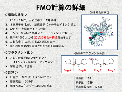 | 量子化学計算(FMO計算)を行うには、最初に、水素原子を含めた原子座標を準備しなければなりません。そこで、PDBの構造情報から複合体の初期構造を作成し、分子動力学計算を行いFMO計算に用いる原子座標を決めました。今回は、アミノ酸残基(103残基)を1つのフラグメントとし、GN8分子は4つのフラグメントに分割しました。また、計算には、van der Waals相互作用を考慮できるMP2法を用いました。 | |||