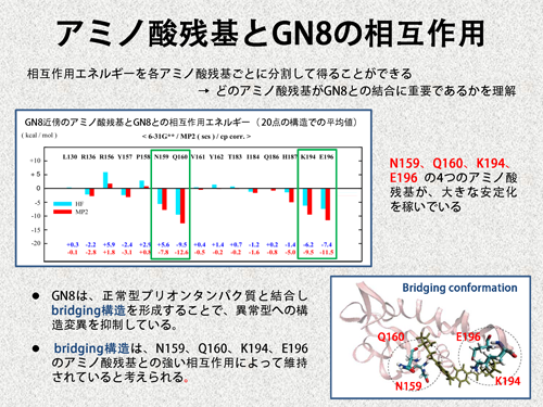 | FMO法では、フラグメント間の相互作用エネルギー(IFIE)が定義されます。よって、アミノ酸残基を1つのフラグメントとして計算した場合、残基ごとに分割した相互作用エネルギーが得られます。この情報から、リガンドとタンパク質の結合において、どのアミノ酸残基が重要であるかを知ることができます。GN8とPrPの場合、N159、Q160、K194、E196の4つのアミノ酸残基が、複合体の安定化に大きく寄与していました(下図)。つまり、構造変異の抑制に重要な架橋構造は、これらのアミノ酸残基との強い相互作用によって維持されていると考えられます。 | |||