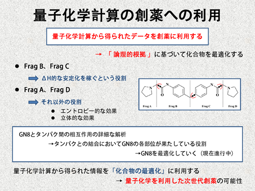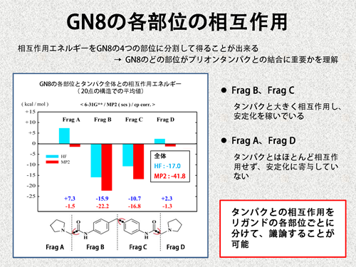 | これらのデータが、創薬にどのように利用できるかを考えてみます。通常、量子化学計算で得られるのは、結合自由エネルギーのエンタルピー項(ΔH)への寄与です。よって、GN8のFrag BとFrag Cは、PrPとの結合において、ΔHを稼ぐ役割を果たしていると考えることができます。一方、Frag AとFrag Dは、ΔHにはほとんど寄与していません。よって、これらの部位は、結合自由エネルギーのエントロピー項への寄与や立体的効果を請け負っていると考えられます。現在、我々は、「リガンド分子の各部位の役割」を知ることで、化合物の最適化を効率的もしくは論理的に行う事を目指しています。 | |||