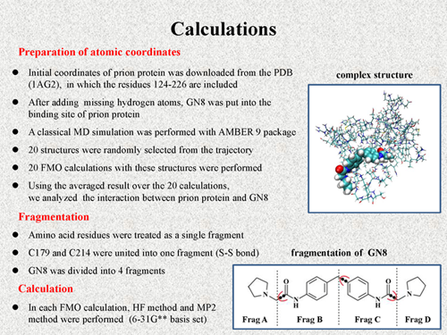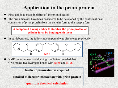 I show the application of the fragment molecular orbital (FMO) method [2] to the prion protein, in which our aim is to make inhibitor of the prion diseases. The prion diseases have been considered to be developed by the conformational conversion from the cellular form to the scrapie form. Thus, we have to find a compound having ability to stabilize the prion protein of cellular form by binding to them.