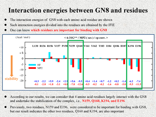 According to our results, we can consider that 4 amino acid residues largely interact with the GN8 and undertake the stabilization of the complex. Previously, two residues of N159 and E196 were considered to be important for the binding with GN8. But, our calculation indicates the other two residues Q160 and K194 are also important. As shown here, using the IFIE, we can know which residues are important for binding with the ligand molecule. |