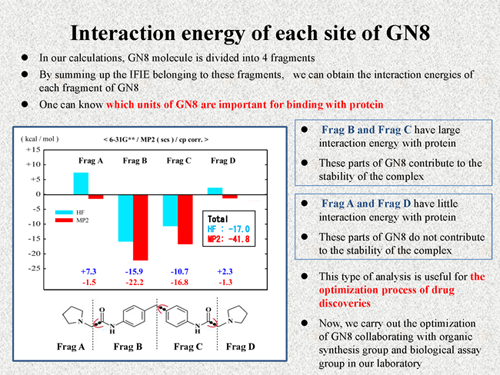 According to our result, Frag B and Frag C have large interaction energy with protein. Thus, we can consider that these parts of GN8 contribute to the stability of the complex. On the other hand, Frag A and Frag D have little interaction energy with protein. We consider that these parts of GN8 do not contribute to the stability of the complex. Like this, with the IFIE, we can know which units of the ligand molecules are important for binding with protein. We expect this type of analysis is useful for the optimization process of drug discoveries. Now, we carry out the optimization of GN8 with organic synthesis group and biological assay group in our laboratory. |
