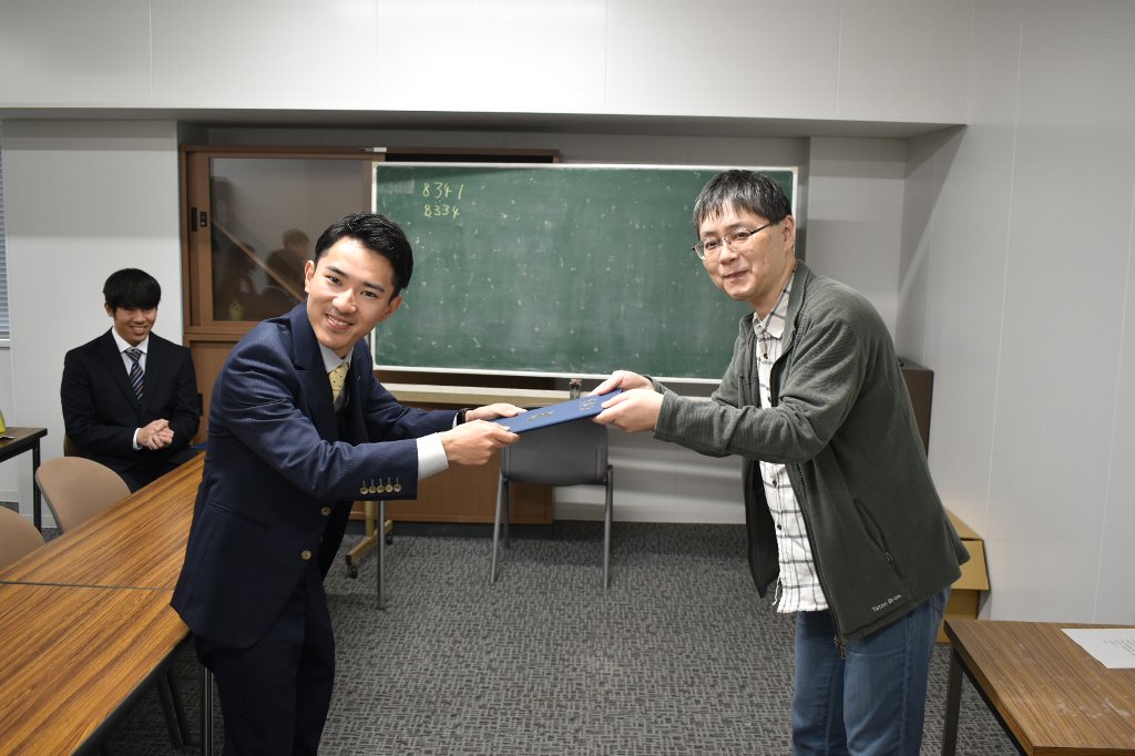渡邉君が受賞した南日本分析化学フォーラム ポスターデザイン賞の賞状が届いたので授与式を行いました。